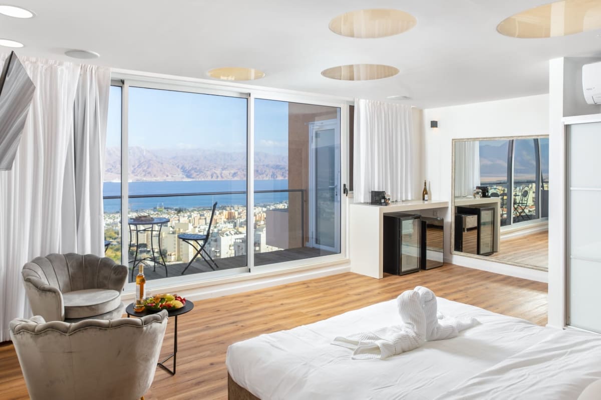 Люкс Sapphire Lakshari — роскошные и тихие апартаменты с садом, собственным двором, бассейном с подогревом в зависимости от сезона, внутри бассейна полная уединенность, на выходе из бассейна есть возможность выйти незаметно (для тех, кто заботится, свяжитесь с нами для получения точной информации по этому вопросу) и захватывающий вид на Эйлатский залив и горы Эдом. В квартире 2 спальни, каждая с двуспальной кроватью, есть возможность добавить матрас для пятого гостя, гостиная с 70-дюймовым телевизором Smart TV, полностью оборудованная кухня (индукционная плита, духовка, встроенный холодильник, кофемашина эспрессо), телевизоры Smart TV в каждой комнате, душ и туалет. Подходит для пары или пары с детьми, не для вечеринок. Бесплатная частная парковка.