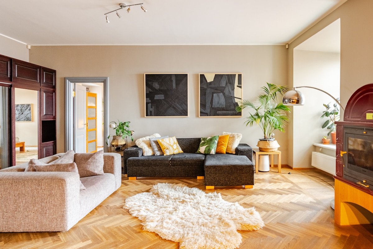 Мое жилье похоже на зеленый оазис в центре города: 20 минут пешком до Старого города. К услугам гостей спальня - гостиная с кроватью размера King size и двуспальной кроватью размера King size, а также диван-кровать, обеденная кухня и туалетная ванная комната. В спальне-гостиной можно разжечь огонь в камине, посмотреть телевизор, просмотреть книги или поработать с собственным компьютером, наслаждаясь безлимитным Wi-Fi. Летом вы также можете позавтракать в саду. Идеально подходит для пар, семей, одиночных и тех, кто приехал в командировку.