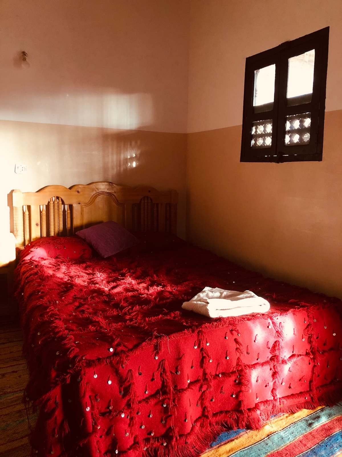 Розовая комната — это уютная отдельная комната, расположенная под мезонином. В квартире: • Одна двуспальная кровать. • одна односпальная кровать; • отдельная ванная комната; Удобный вариант для пар, друзей или небольших семей, которые хотят уединения во время пребывания в исторической касбе. Сообщите нам заранее, если вы хотите, чтобы во время вашего пребывания вам готовили еду: • Ужин: 12 евро с человека. • Завтрак: 5 € с человека • Ужин и завтрак: 15 евро с человека.