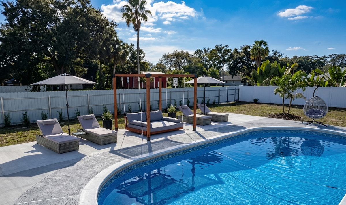 🏠 Welcome to this incredible, stunning & fully updated heated pool & spa home located on a serene waterfront canal of Tampa Bay! Enjoy the dock for fishing & relaxing. Fast WIFI, Samsung Smart TVs, a game room with an air hockey table, ping pong & pool table, and even a Pac-Man machine will make your stay memorable & fun! Most importantly, dive into this amazing heated pool & spa right in front of the canal!