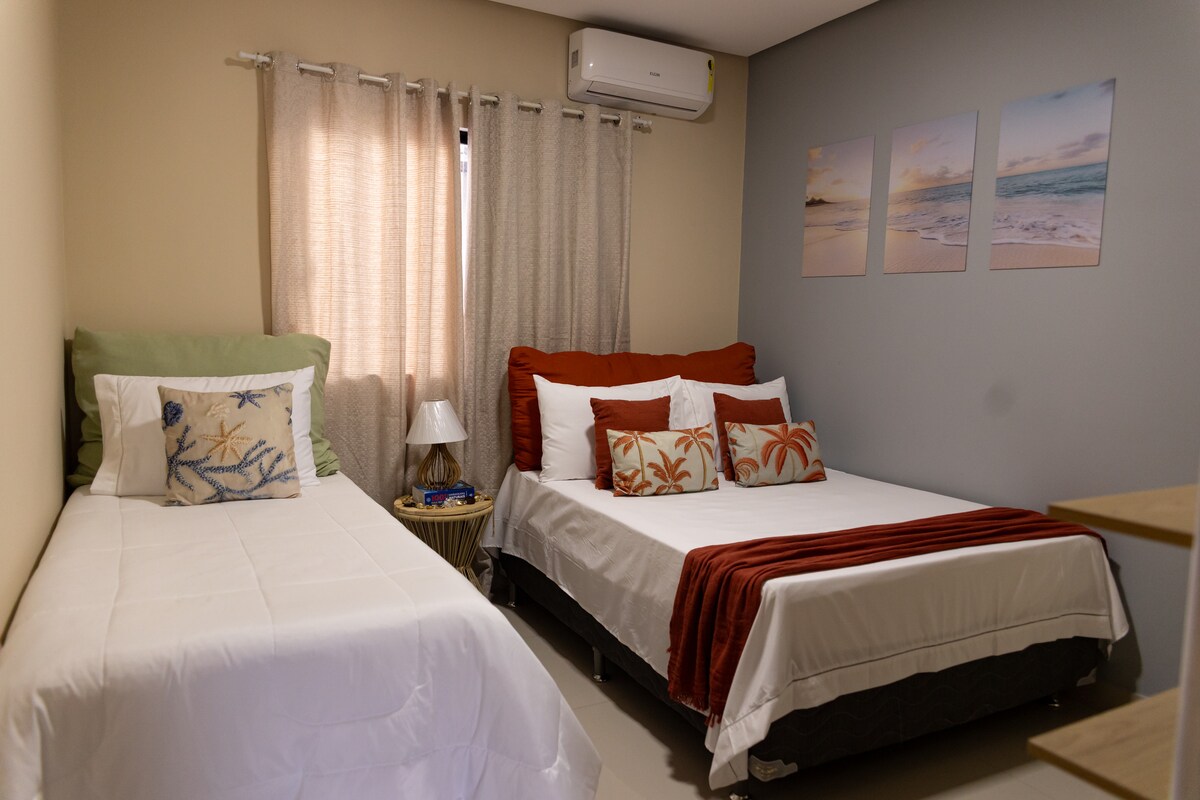 Добро пожаловать в наш дом в Порту-Сегуро! Наш дуплекс расположен на пляже Таперапуан, рядом с палаткой, хорошим пляжем, деревянной ложкой, супермаркетами, аптекой и т. д., куда не нужно передвигаться на машине, чтобы добраться до пляжа. У нас есть 3 спальни, 2 с люксами, 1 социальная ванная комната, кондиционер во всех спальнях, телевизор во всех спальнях, полноценная кухня, гостиная с 60-дюймовым телевизором, зона обслуживания, а в кондоминиуме есть бассейн, зона барбекю и гараж. У нас есть Wi-Fi.