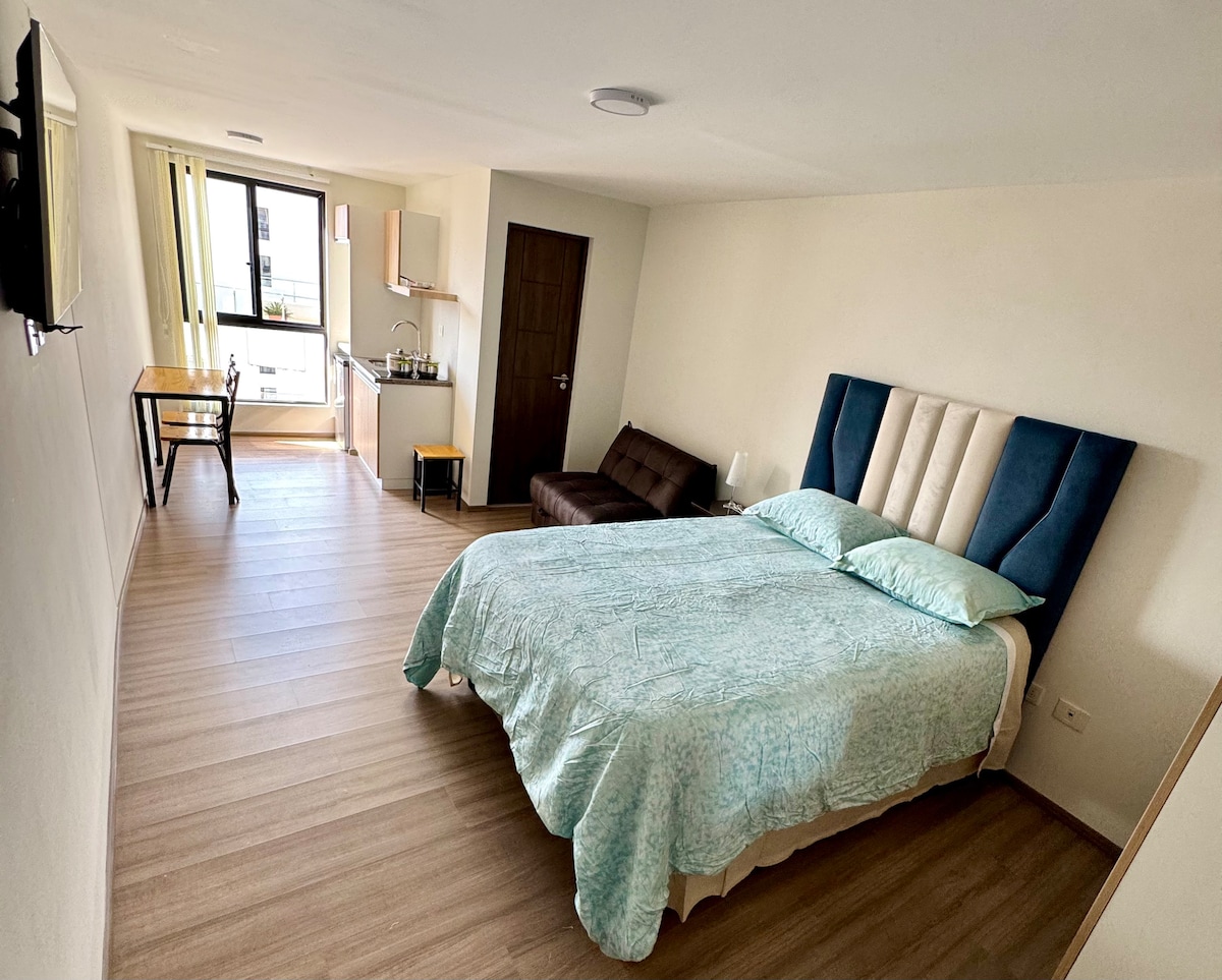 Наслаждайтесь простотой этого тихого и центрального жилья на лугу города Кочабамба. В окружении супермаркетов, ресторанов и туристических мероприятий. - Wi-Fi. - 1 кровать для двух человек. - Smart TV; — Отдельная ванная комната с горячим душем. - оборудованная кухня; - Сушильная машина. — Электрический чайник. -микроволновка - затемняющие гардины; - Тщательная уборка.
