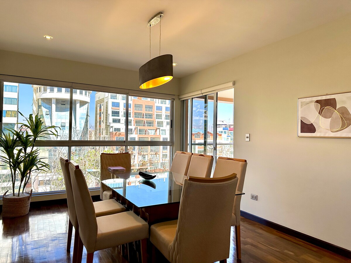 Добро пожаловать в роскошь, комфорт и чистоту этой квартиры в лучшем месте Кочабамбы. Вы будете в лучшем районе для деловых или семейных поездок. - 80-дюймовый телевизор Smart TV; - Рядом с традиционными боливийскими рынками. - Рядом с ресторанами. - Панорамный бассейн. - Двуспальная кровать. - Потрясающий вид на город. - Стиральная машина