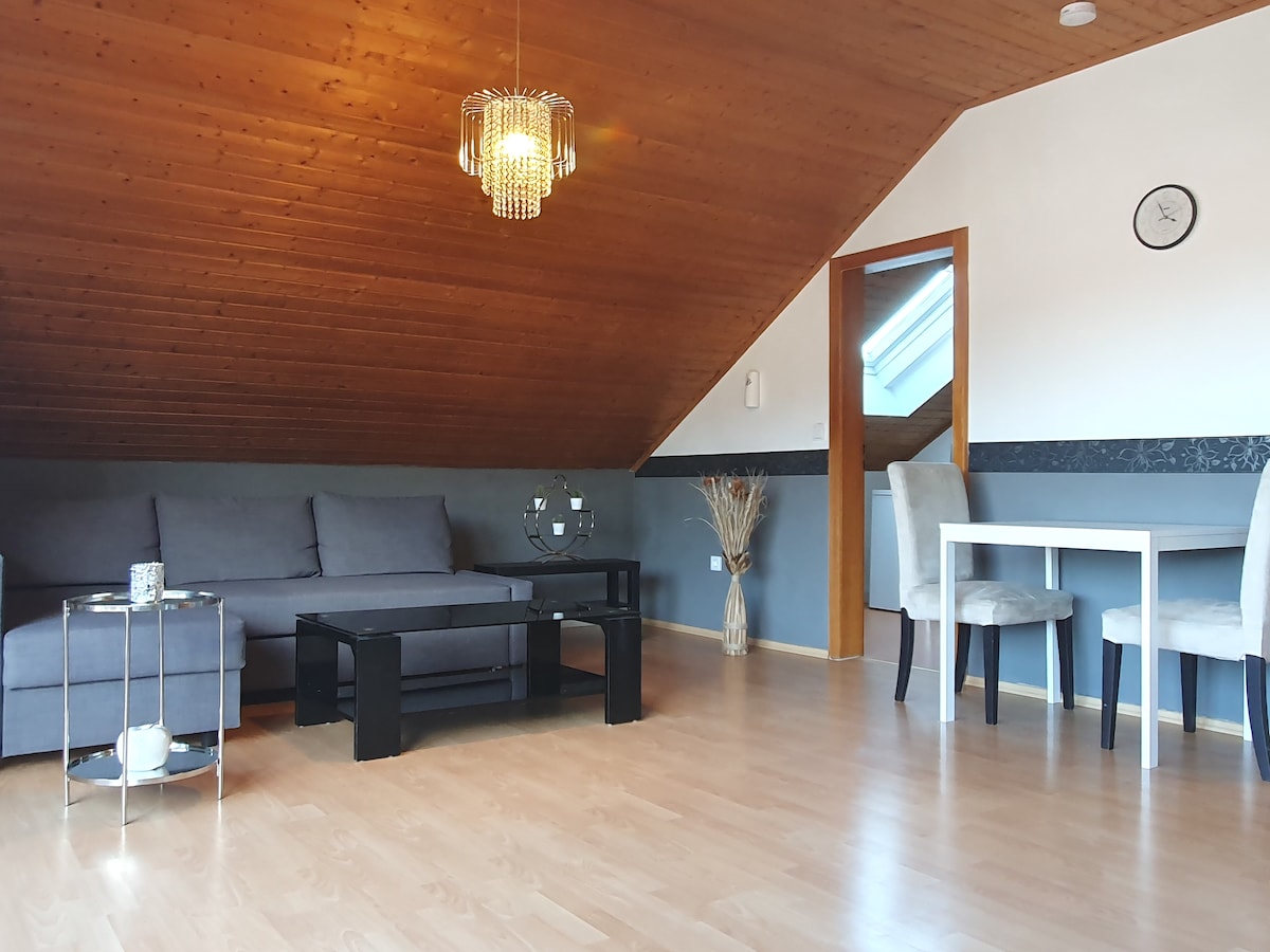 Мансардная квартира - это новое здание с хорошей теплоизоляцией. До центра города можно добраться на различных автобусных маршрутах (бесплатно по субботам) или пешком около 30 минут. До магазинов (Aldi, Denn 's, Edeka, dm, пекарни, мясная лавка, сберегательный банк, аптека) можно дойти пешком за 100 метров. Обширные открытия в поле и в лесу могут начаться после нескольких минут ходьбы.
