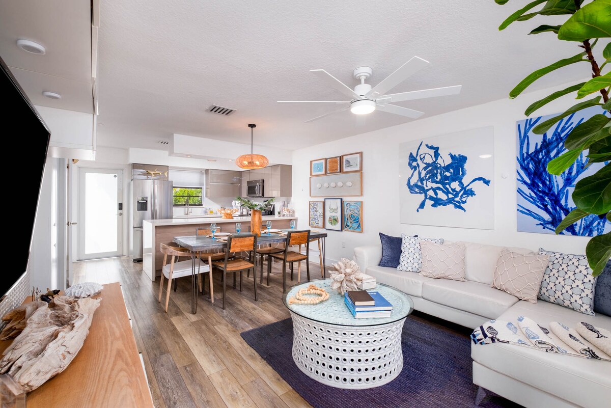 Этот прибрежный курорт идеально подходит для пар, семей или яхтсменов, желающих исследовать лучшие места Ки-Уэста. Займитесь сноркелингом прямо у причала, прокатитесь на каяке по мангровым зарослям или расслабьтесь с напитком, любуясь закатом над каналом. В нескольких шагах от двух бассейнов с подогревом, детской площадки и песчаного пляжа, а также всего в 0,3 мили от продуктовых магазинов и ресторанов. Ловите рыбу, ныряйте на знаменитые рифы или просто отдыхайте под тики — этот дом превратит ваш отдых в рай.