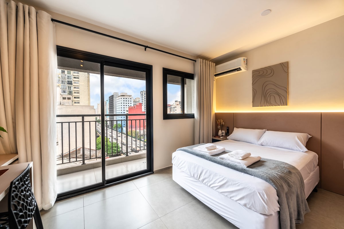 Espaço com todas as comodidades para estadias curtas ou prolongadas, tranquilo, completo e confortável, vista da cidade, sacada a céu aberto no 21o. andar de um edifício patrimônio arquitetônico dos anos 1950. Cozinha equipada, hidromassagem, Ar Cond quente/frio, água quente, TV QLED 50",enxoval fino completo, cama excelente, espaço de trabalho com internet Starlink, Echo-dot Alexa, este é um lugar especial para trabalho ou lazer, para renovar suas energias e estar perto de tudo em S. Paulo🥂