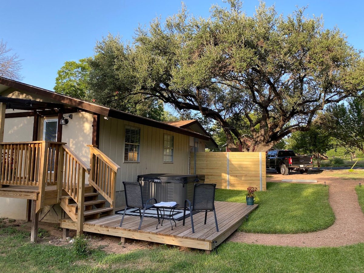 Полмили пешком до главной улицы! Люкс Bluebonnet Hideaway очень комфортабельный и уединенный. Люкс - это недавно отремонтированная просторная спальня со сводчатым потолком, деревенскими потолочными балками и большим количеством естественного света. В обновленной ванной комнате есть большой стеклянный душ и гардеробная комната. В хорошо укомплектованном кофейном баре есть мини-холодильник, кофеварка Keurig и микроволновая печь. Снаружи есть собственная терраса с гидромассажной ванной. Парковка на территории. Люкс полностью частный, с собственным входом.