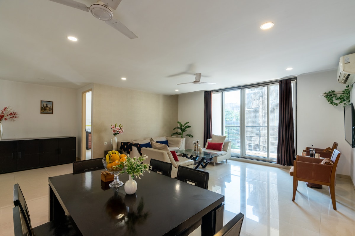 Откройте для себя идеальное сочетание роскоши и комфорта в этой красивой просторной квартире с 2 спальнями. Квартира идеально подходит для деловых путешественников и посетителей BKC и предлагает спокойную атмосферу с прекрасным видом на деревья из каждого окна – ваш спокойный отдых в городе, который никогда не спит. Эта современная гавань, расположенная в центре, обещает расслабляющую обстановку, пока вы исследуете Мумбаи. Квартира: - 8 минут до внутреннего и международного аэропорта;