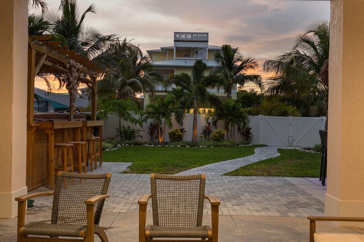 Отдохните в нашем оазисе на берегу острова Анна-Мария! В этом светлом, обновленном доме есть собственный бассейн с подогревом, джакузи и док. Идеально подходит для семей, всего в 5 минутах ходьбы от всемирно известных пляжей залива. Наслаждайтесь потрясающими восходами солнца, специальным рабочим пространством и современным прибрежным декором. Исследуйте остров с легкостью на бесплатном троллейбусе. Ваш идеальный отдых ждет вас!