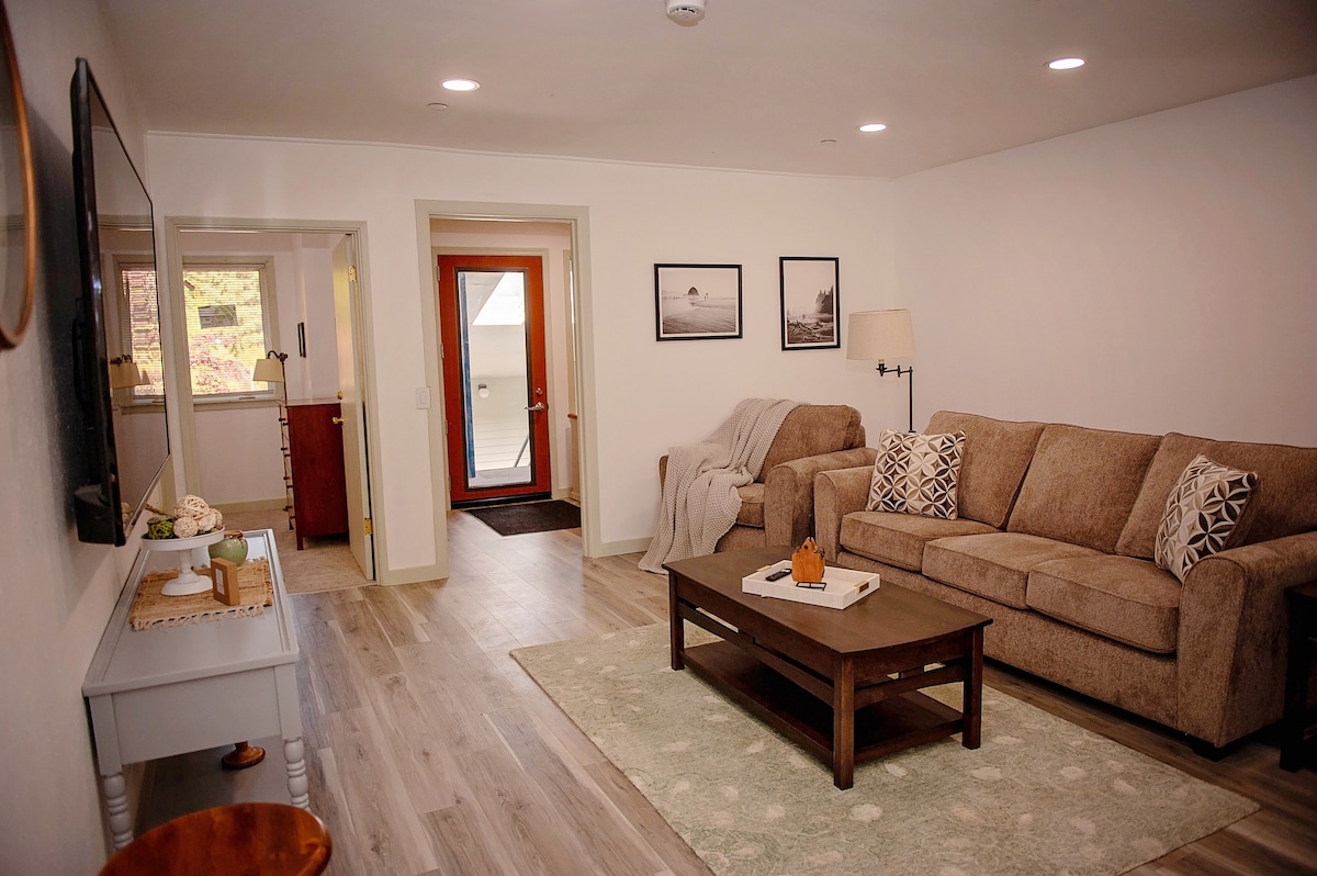 Вы и ваши пушистые друзья можете расслабиться и насладиться этим дуплексом с 1 спальней с климат-контролем, крытой парковкой и удобствами, к которым вы привыкли дома. Сядьте на наш удобный диван-шезлонг и посмотрите шоу Amazon или посмотрите любимый стриминговый сервис на 50-дюймовом смарт-телевизоре. Спать в двуспальной кровати размера King size с удобным 12-дюймовым матрасом и 2 типами подушек. Просыпайтесь и пейте блинчики с сиропом и кофе или чаем. Прогуляйтесь с собакой в парк Гарри Тодда с выходом к озеру всего в 2 минутах ходьбы.