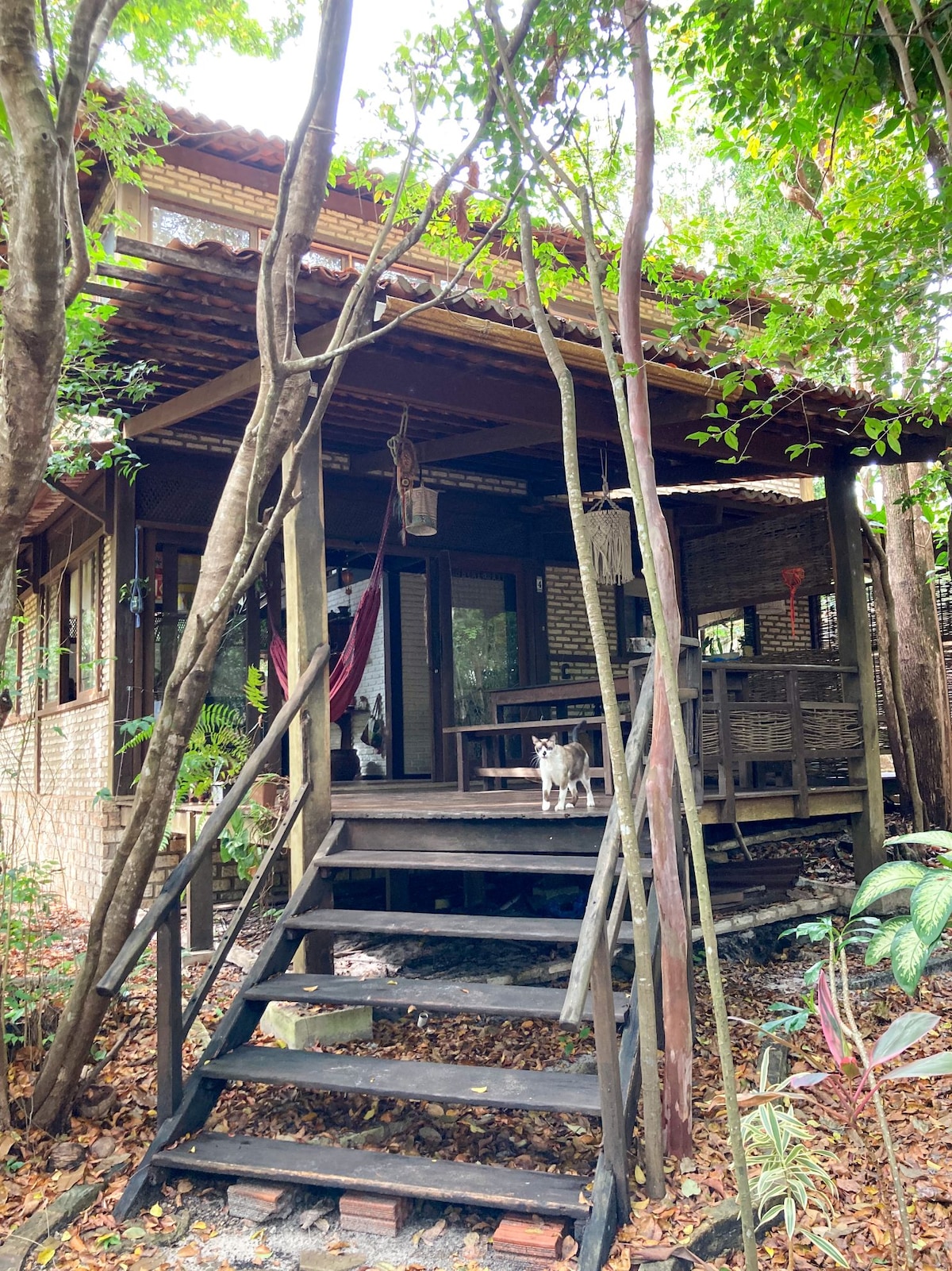 São lindas casinhas independentes, com amplo jardim em meio às arvores, agora com esse espaço totalmente novo. Conta com 1 cama de casal, (roupas de cama e toalhas de banho trocadas a cada semana), Ar Condicionado e ventilador de teto, TV , WiFi, mesa para trabalhar, cozinha americana equipada com utensílios básicos, fogão e geladeira, banheiro com chuveiro elétrico, rede, área de serviço, chuveiro externo e estacionamento externo para carro. Estou disposto a qualquer ajuda ou informação.