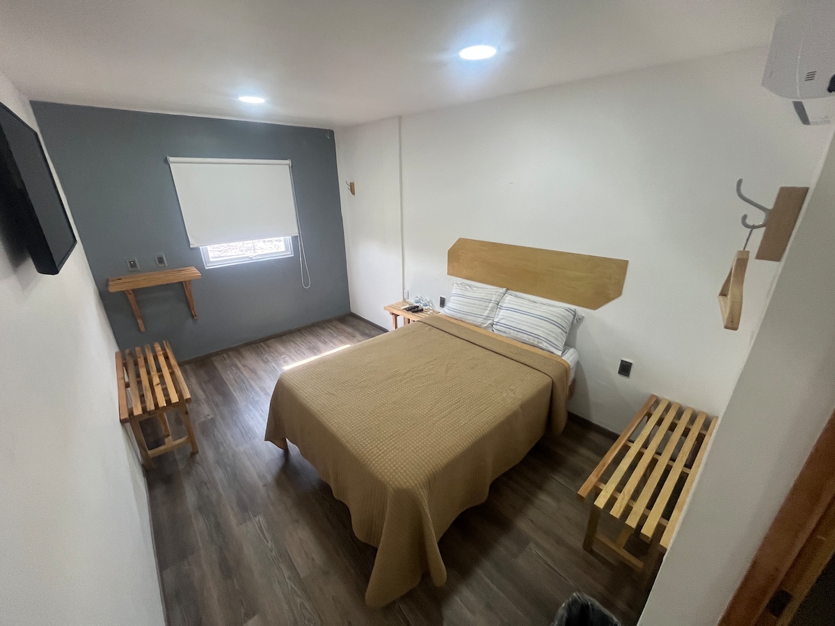 Очень просторная спальня, примыкающая к главному дому, с кондиционером, wifi, кабельным телевидением, 2 двуспальными кроватями и двухъярусной кроватью, ванной комнатой с горячей водой, отдельным входом, парковкой для автомобиля, центральным районом, рядом с автовокзалом, банками, торговыми центрами. Примечание. В зависимости от потребностей вы можете добавить диван-кровать, кроватку, напольный матрас или матрас.