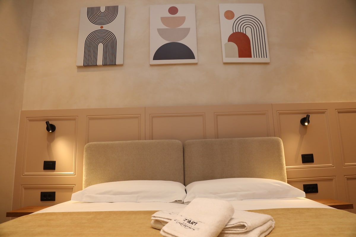 Представляем наш роскошный гостиничный номер 201, расположенный в 2 минутах ходьбы от старого базара Круи и центра города. Этот современный оазис, расположенный на третьем этаже, может похвастаться джакузи и захватывающим видом на город. Наслаждайтесь зоной с открытым шкафом и телевизором Smart TV с Netflix для ваших развлечений. Вы окажетесь всего в нескольких минутах ходьбы от исторического замка Кройя и в окружении множества ресторанов, кафе, магазинов, банкоматов, пекарен, пунктов обмена валюты, аптек, сувенирных магазинов.