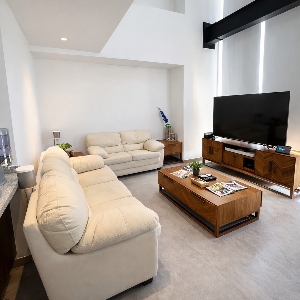 Disfruta de un espacio moderno, luminoso y diseñado con un estilo minimalista que invita al descanso y la comodidad. Este departamento ofrece una experiencia acogedora desde el primer momento: una estancia y cocina integradas con acabados contemporáneos, iluminación cálida y amplios canceles de cristal que se abren hacia una terraza privada perfecta para relajarte, tomar un café o disfrutar del atardecer. Perfecto para familia, parejas, viajeros o negocios.
