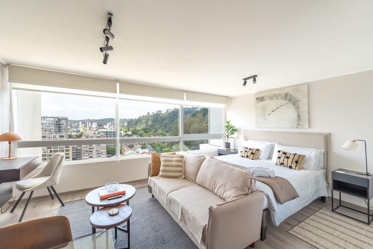 Disfruta de nuestro estudio en el corazón de Concepción, cerca de universidades, transporte, centros comerciales y restaurantes. Ideal para dos personas, el departamento incluye cama de dos plazas, cocina equipada, baño con tina, smart TV y mesa para trabajar/comer. El edificio ofrece gimnasio, sala de coworking, sala de entregas, lavandería, quinchos panorámicos y salón gourmet. ¡Conveniencia y confort en una ubicación central!