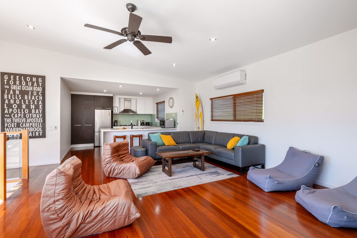 Абсолютный пляжный двухэтажный дом, расположенный на Эспланаде в начале Великой океанской дороги с панорамным видом на океан. Доступ на пляж прямо напротив жилья. Три спальни и две ванные комнаты. Гостиная наверху и полностью оборудованная кухня. Кондиционер/отопление обратного действия. Барбекю Webber на заднем дворе. Душ на улице, чтобы ополоснуться после посещения пляжа. Местные магазины, рестораны, бары и кафе Torquay в 5 минутах езды. Детская площадка с летающей лисицей в 1 минуте ходьбы.
