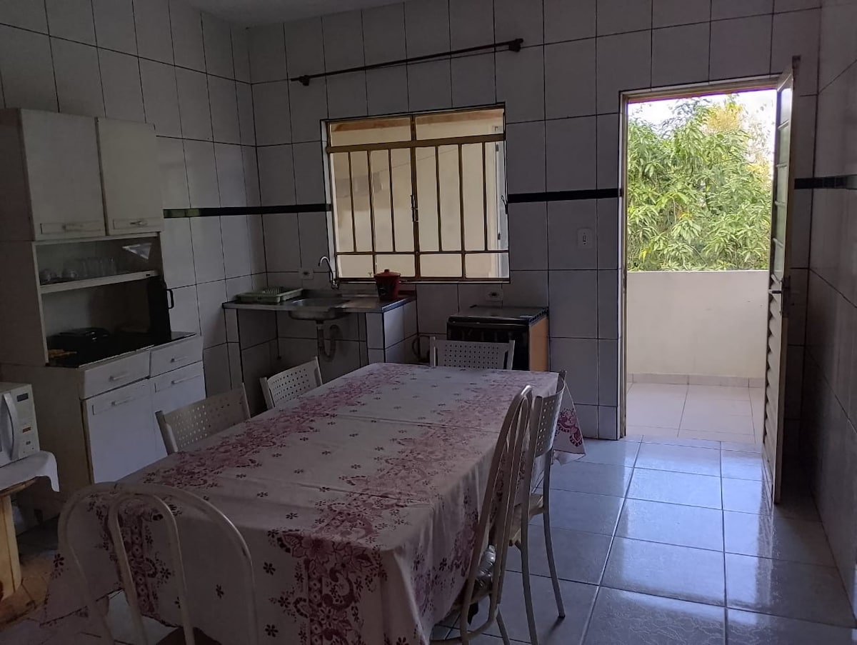 Espaço exclusivo p/ o hóspede, amplo aconchegante c/ bastante claridade. É como estar em casa. Cozinha c/ utensílios p/ uso. Geladeira, fogão, micro-ondas, liquidificador. Lavanderia de uso exclusivo p/ o hóspede c/ tanquinho. TV smart 42' sem canal aberto ( plataformas com conta do hospede), 1 beliche, 1 cama casal, 3 solteiro e 1 sofá cama casal. Internet. Para ver TV é usado uma das camas de solteiro. cobrado a parte sob consulta água 500ml, bolos,, biscoitão, salada de frutas café