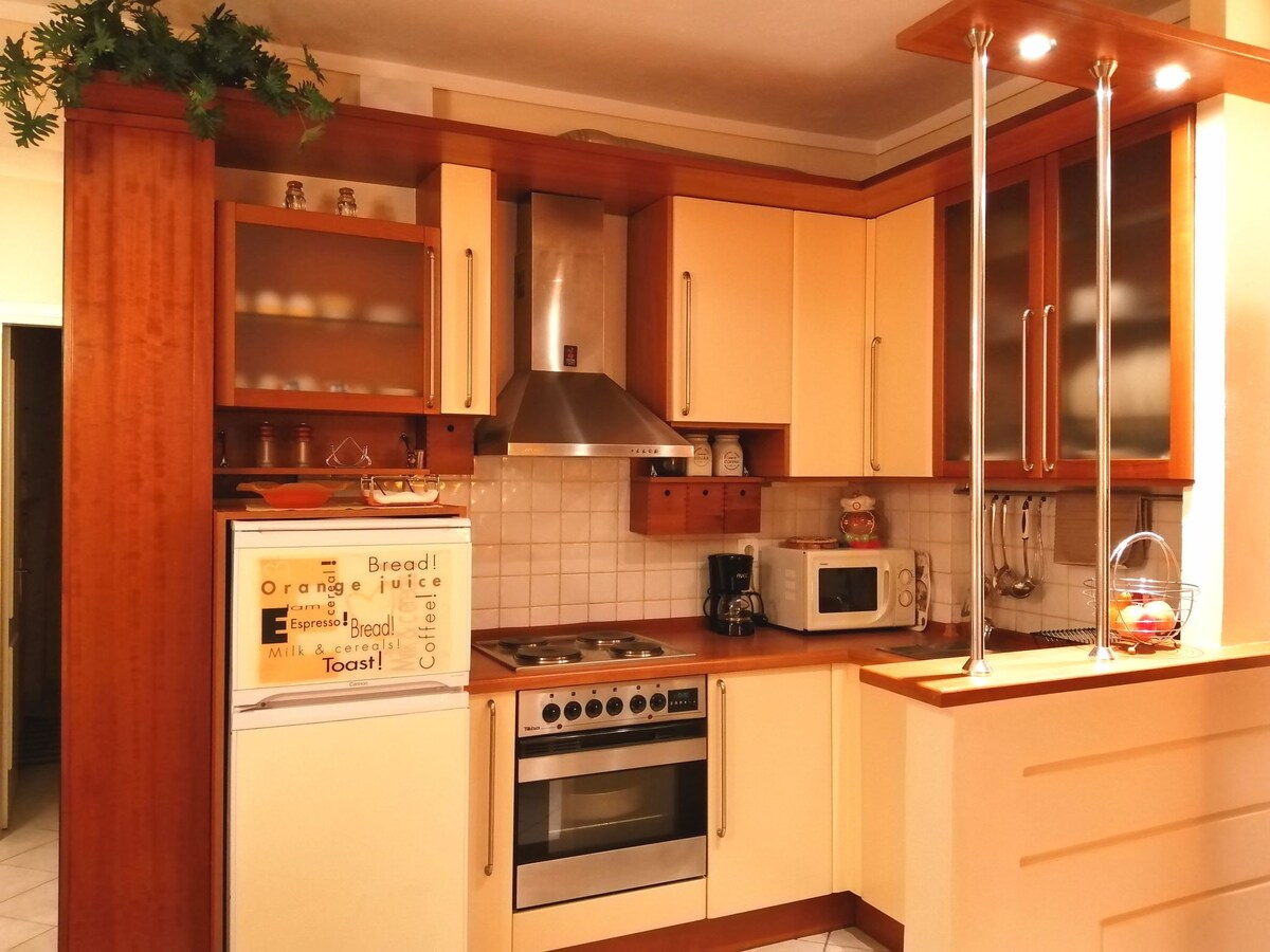 Моя милая и уютная квартира площадью 40 кв. м. Дом находится в 5 минутах ходьбы от станции метро Папафи, рядом с кольцевой дорогой и рядом с автобусной остановкой. Дом оформлен простой, но тщательно продуманной мебелью с красивой кухней в гостиной и милой спальней. В нем есть необходимость в гостеприимства.