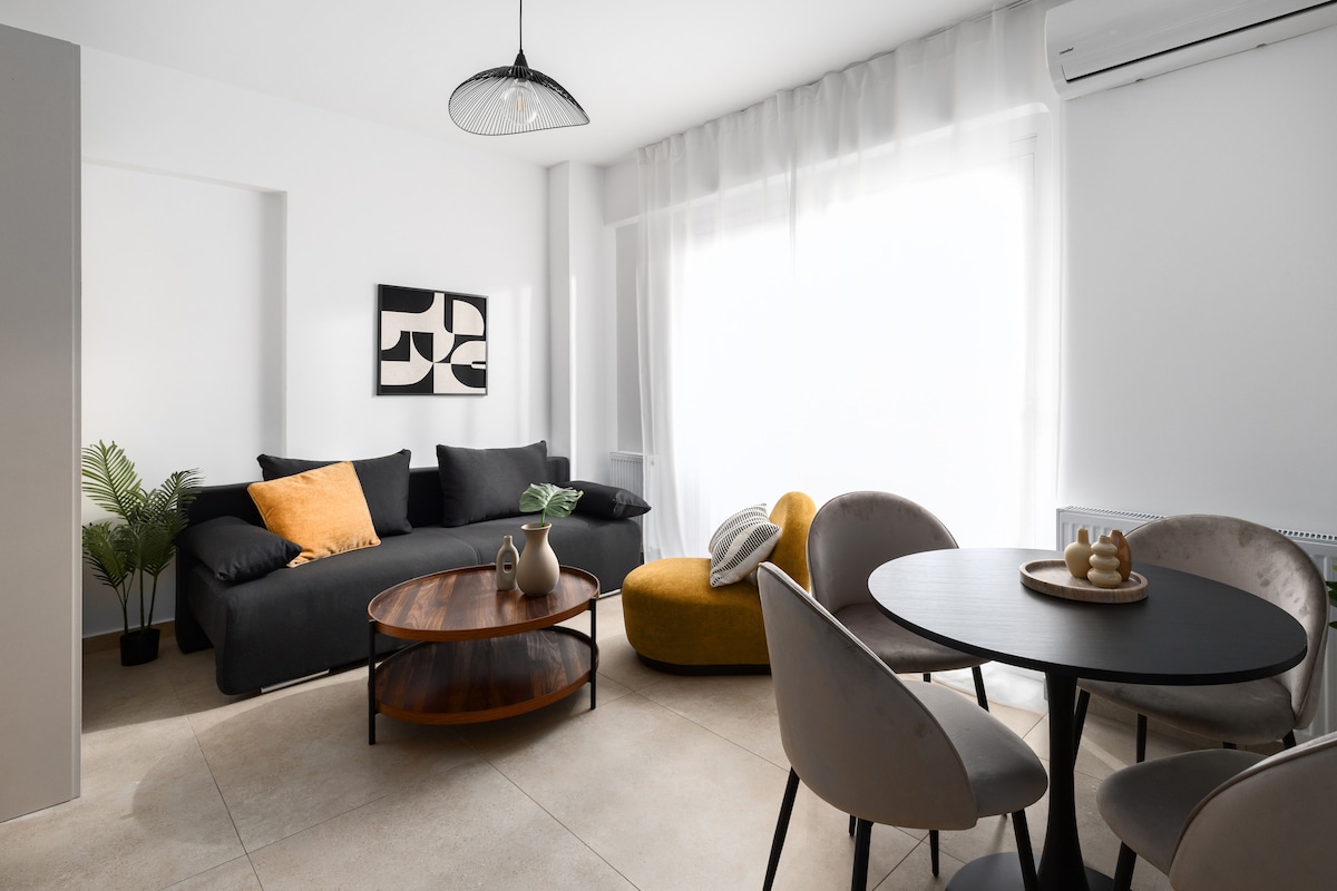 Добро пожаловать в наши стильные, недавно построенные апартаменты на улице Агиу Димитриу в Салониках. Предназначенные для современного комфорта, они предлагают уютные, наполненные светом интерьеры с теплыми нейтральными оттенками, угольными диванами, горчичными акцентами и деталями из натурального дерева, создавая уютное пространство для отдыха. Расположенные рядом с церковью Святого Димитрия, магазинами, кафе и местной жизнью, они обеспечивают спокойную, но удобную базу для краткосрочного или длительного пребывания.