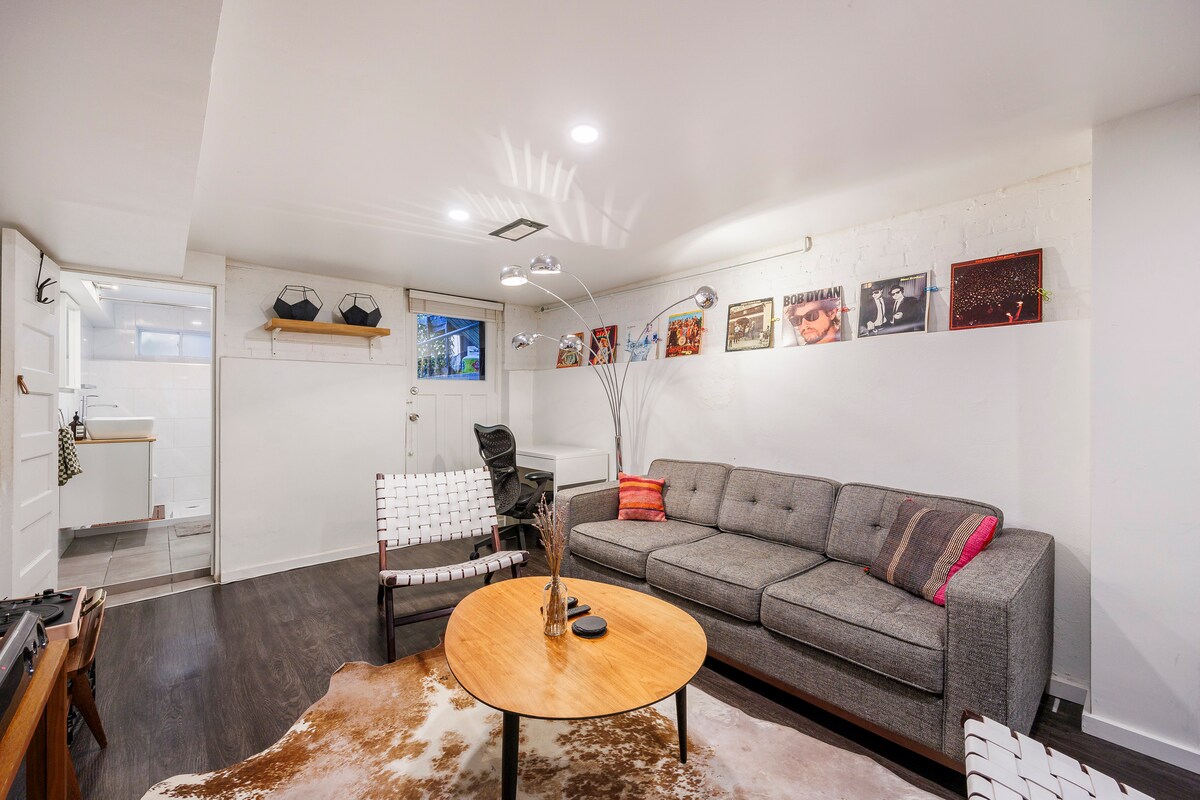 Расслабьтесь под винтажными пластинками в этой модной и уютной квартире Trinity Bellwoods. Недавно отремонтированный дом с чистыми линиями и открытой планировкой - яркий, белый и комфортабельный с разноцветными акцентами, которые добавляют ретро-бработу к современной эстетике. Квартира находится на нижнем уровне исторического дома, расположенного между Dundas West, Queen West, The Ossington Strip и оживленным парком Торонто Trinity Bellwoods. STR-2009-GLXRPG