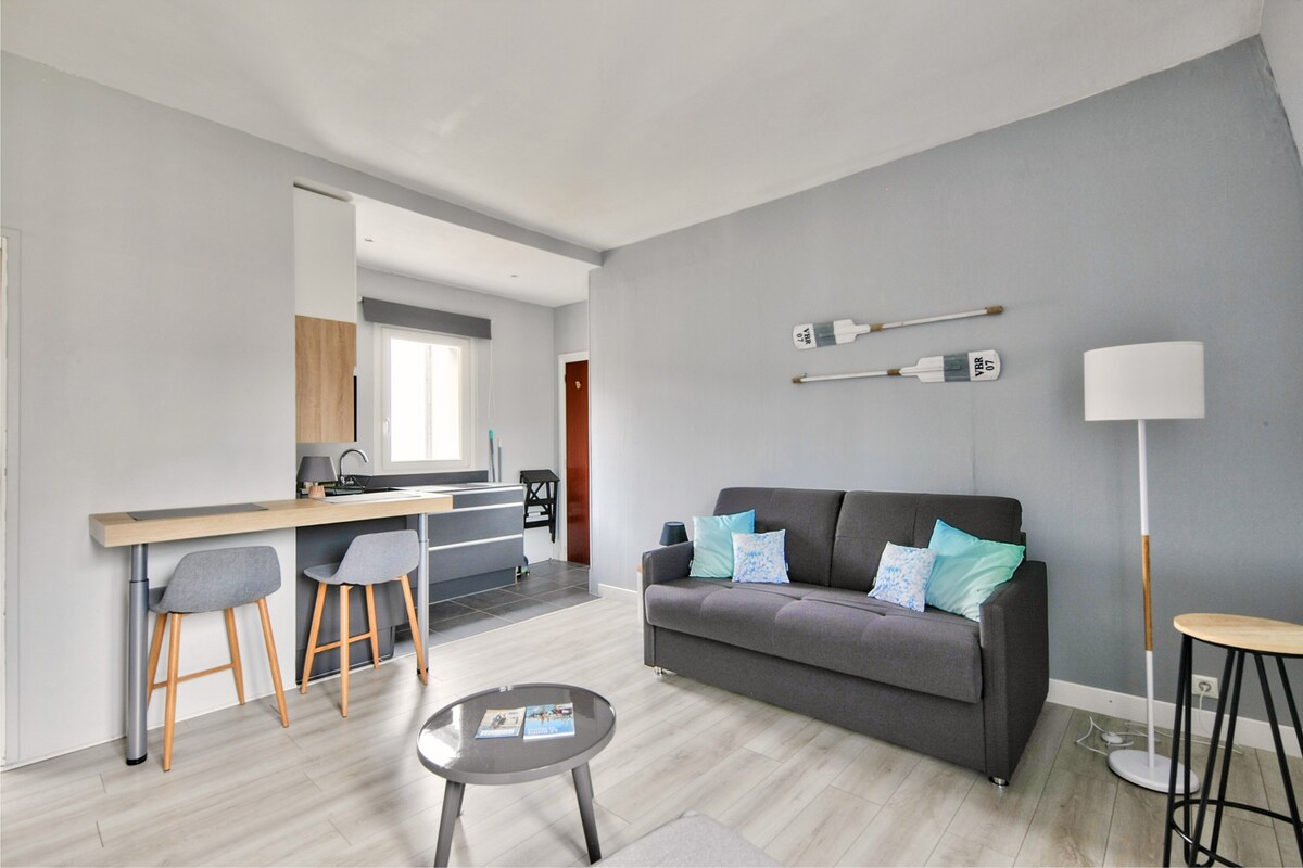 Наслаждайтесь нашей студией с балконом, выходящим на юг, и ванной Бальнео в Марине. В квартире есть настоящая кровать 160 x 200 с постельным бельем, Wi-Fi, подключенный телевизор, кухня с посудомоечной машиной, кофемашина с кофемолкой, органический чай и содовая, 1 бутылка свежего местного сидра, Wi-Fi. В ванной комнате, оборудованной спа-ванной для одного человека, гарантирован отдых. Туалет отдельный. У подножья здания бесплатная парковка.