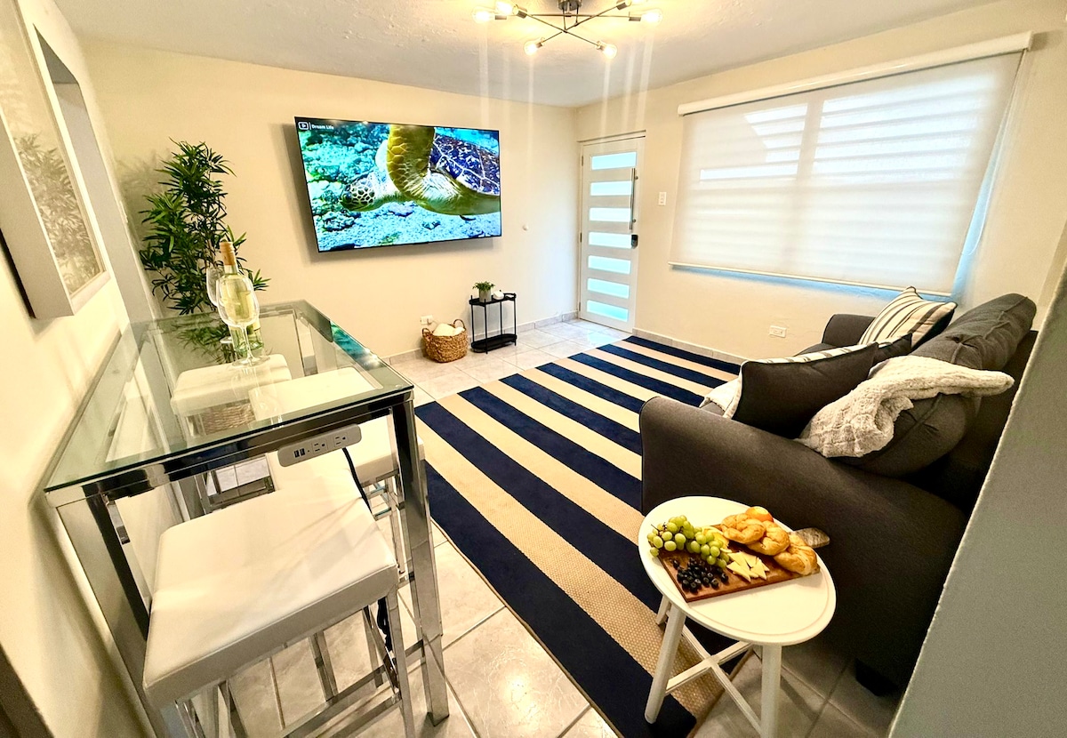 Частная современная квартира с 1 спальней в Каролине, Пуэрто-Рико. К услугам гостей стильная современная кухня в деревенском стиле, уютная гостиная, отремонтированная ванная комната, Интернет, горячая вода, кондиционер для вашего комфорта. Отдельный вход и вход без ключа. Всего в 15 минутах езды от Международного аэропорта имени Луиса Муньоса Марина. Идеально подходит для путешественников, ищущих спокойное и доступное жилье рядом с Сан-Хуаном. Идеально подходит для пар или одиночных путешественников, ищущих комфорт и уединение. Одно зарезервированное парковочное место. Доступны поездки на автомобиле!
