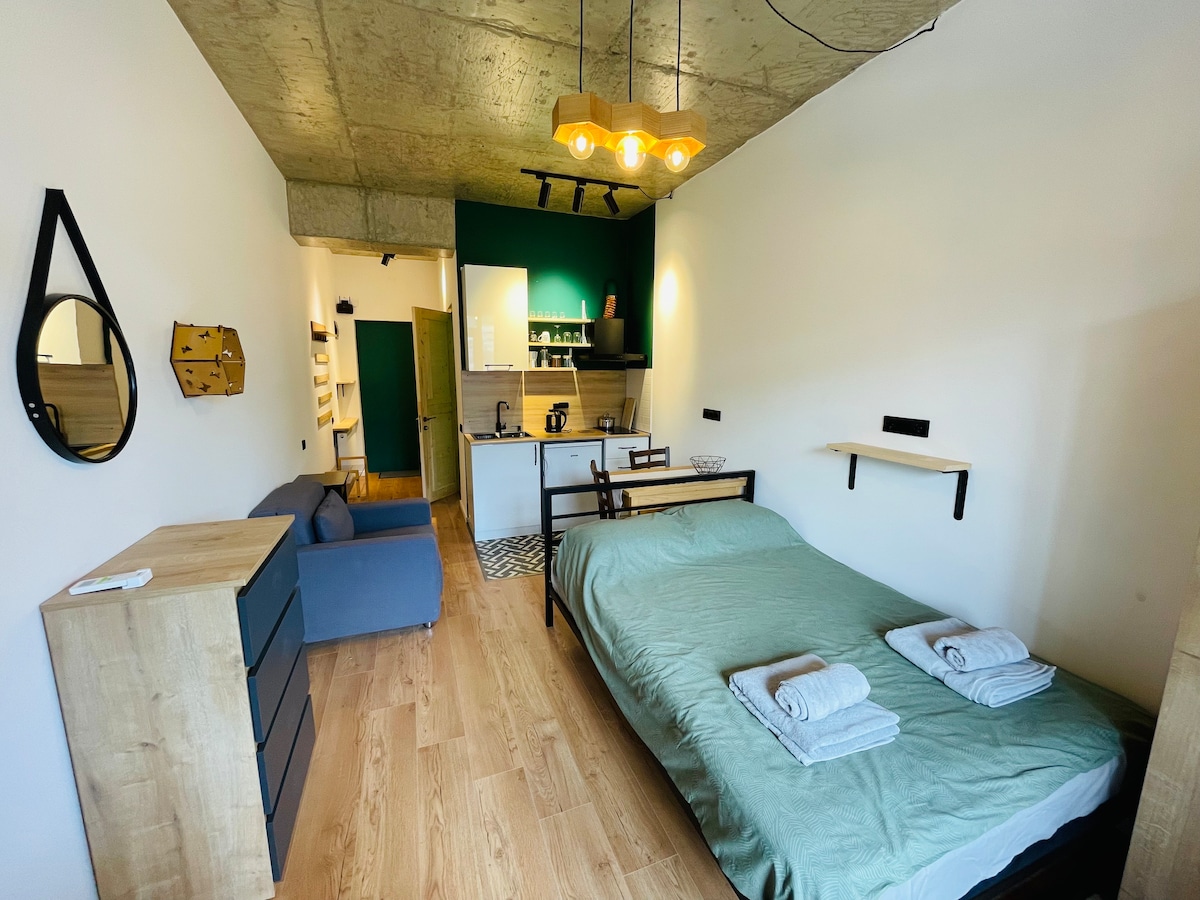 ПРОМЫШЛЕННАЯ студия в старом советском здании, спроектированном компанией VIRSTAK, предлагает уникальную атмосферу с захватывающим видом на ГОРОД днем и ночью, которым можно наслаждаться из ВАННОЙ. -100% РУЧНАЯ РАБОТА. — Не СЛУЧАЙНАЯ уютная/функциональная квартира, удобства студии состоят из старой винтажной и промышленной мебели, для некоторых людей это может быть некомфортно, исходя из личного вкуса. Художественная атмосфера, заставляющая вас чувствовать себя как в кино. — ВИННЫЙ ЗАВОД — 9 СОРТОВ ВИНА. - кинопроектор; Трансфер из аэропорта Suzuki Swift 80 Gel
