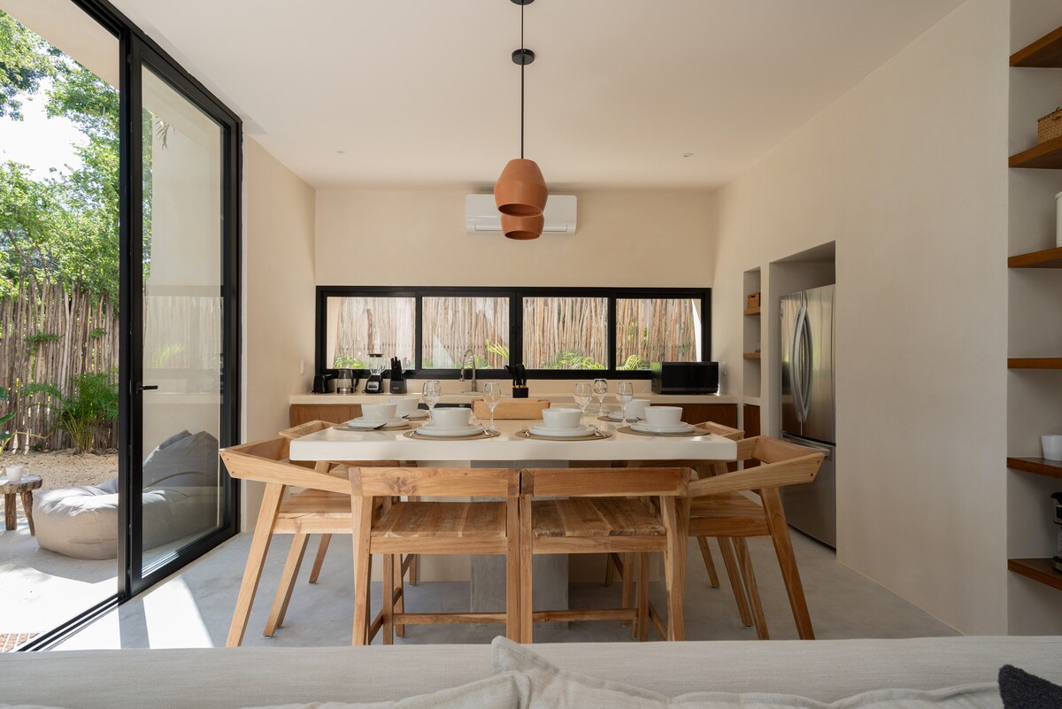 Исследуйте джунгли и карибское море Тулума из нашего комплекса UJO, расположенного в центре Тулума, недалеко от всего и всего в 5 минутах езды на машине от пляжа. В квартире есть терраса и гамак для отдыха, 1 спальня с двуспальной кроватью размера "king-size" и шкафом для одежды, гостиная с диваном-кроватью и телевизором, полностью оборудованная кухня с кофеваркой, холодильником и всем необходимым для приготовления пищи, бар для еды и полная ванная комната.