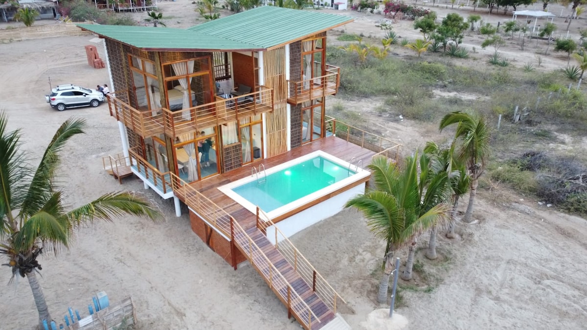 Linda casa de estreno con piscina, diseño único con arquitectura de la zona del bosque seco, en primera fila frente al mar turquesa de Caleta Grau Zorritos Tumbes, mar super rico para bañarse, temperatura tibia, amplia playa de arena blanca. Crea recuerdos inolvidables en este alojamiento único y familiar a 5 minutos de Zorritos y 25 del aeropuerto de Tumbes y del Ecuador