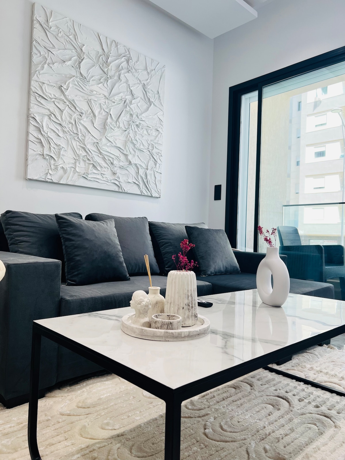 Appartement S+1 lumineux et décoré avec goût, comprenant un salon confortable, une chambre spacieuse, une cuisine moderne entièrement équipée et un balcon agréable. Vous aurez également accès à la salle de sport commune de la résidence. Résidence sécurisée, calme et proche de toutes les commodités, idéale pour un séjour relaxant et pratique.