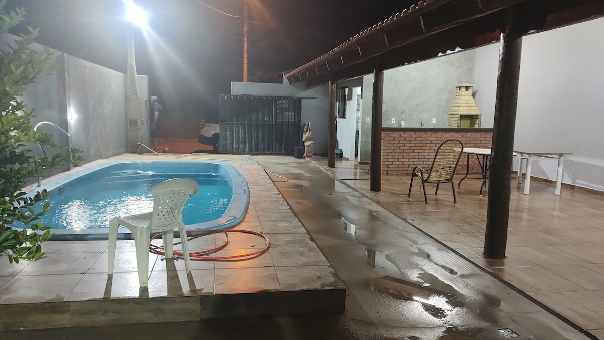 Casa Conchegante с бассейном и кухней для гурманов Расслабьтесь и наслаждайтесь удивительными моментами в этом доме. В доме есть: 2 комфортабельные комнаты: 1 спальня с двуспальной кроватью размера Queen size + 1 спальня с двуспальной кроватью и потолочным вентилятором. 1 с 2 двуспальными кроватями + 1 односпальная кровать. Гостиная с телевизором и Wi-Fi. Кухня оснащена холодильником, морозильной камерой, плитой. Гараж на 3 машины. Придомовая территория с частным бассейном Гурманское пространство с барбекю, деревенским деревянным столом с 4 скамейками + 3 двухместными диванами.