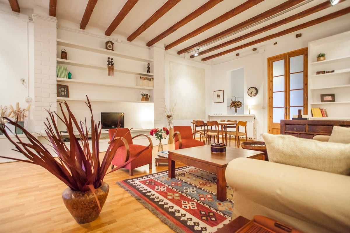 Просторная и светлая квартира площадью 95 м2, полностью отремонтированная, в модернистском здании. Он сохраняет старые элементы, которые делают "Ла Пепа" очень особенным, гостеприимным и уникальным пространством в Барселоне: фасад "trencadís" (архитектурный элемент, широко используемый Гауди и другими модернистскими архитекторами в своих работах) и старую гидравлическую плитку на террасе. Деревянные балки, высокие потолки и декоративная мебель