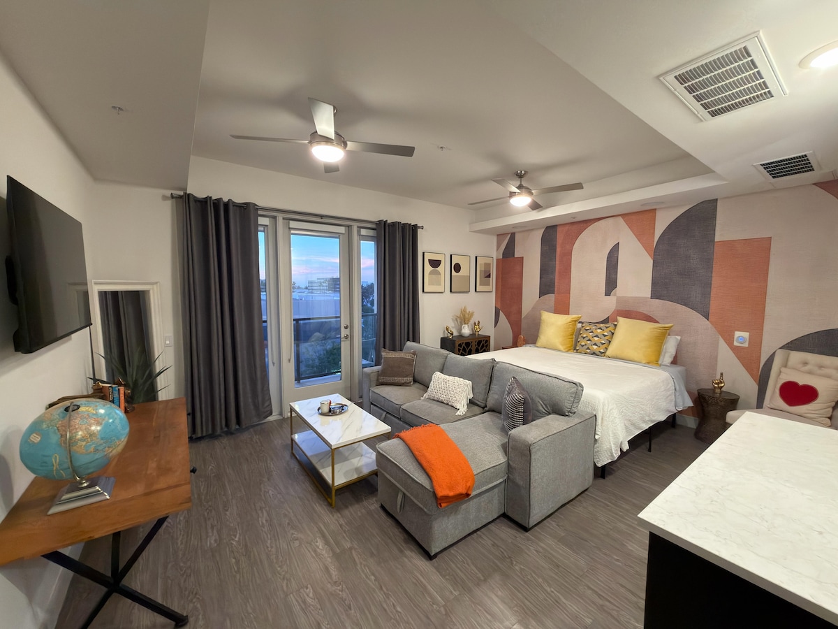 Добро пожаловать в этот прекрасный современный кондоминиум/квартиру с 1 кроватью и 1 ванной комнатой. Кровать размера King size и большой рабочий стол. Просторная гостиная с 65-дюймовым телевизором со Smart TV. Прекрасный диван-облако и два бархатных вращающихся стула. БЫСТРЫЙ WI-FI. Отдельное патио. Полностью оборудованная кухня открытой планировки с кухонным островом. Кофе Keurig K-Cup, электрический чайник, холодильник, лёдогенератор, микроволновая печь. Стиральная машина/сушилка (моющее средство). Одно бесплатное парковочное место. В вашем распоряжении тренажерный зал, бассейн, джакузи. Всегда чисто, дезинфицировано и готово вовремя. Мир в оазисе.