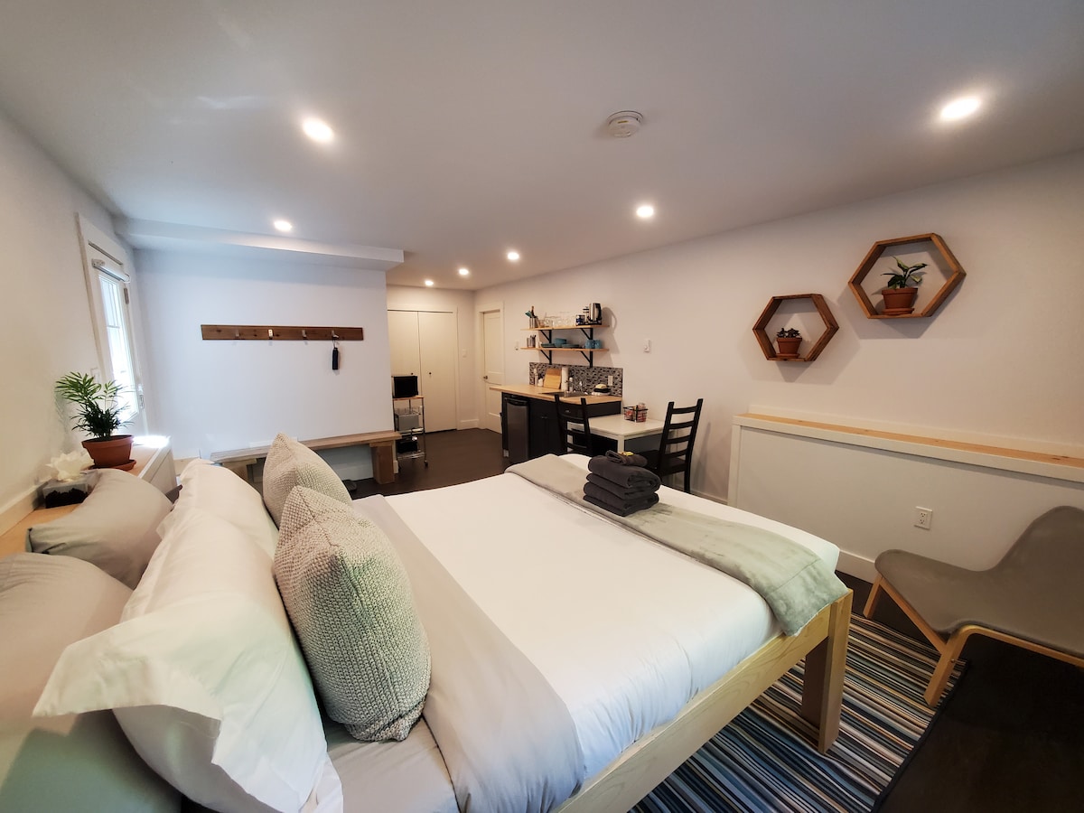 1 of 3 studio style units above garage. Brand new Endy king beds. Semi private balcony and front yard to enjoy. Full bathroom. Mini fridge, microwave, Keurig, toaster, kettle, and dishes provided. Along with high end bathroom essentials like shampoo, conditioner, body wash, lotion, and blow dryer. located a few blocks from the downtown core, 5 min walk to local shops and 2 min walk to local beaches. Set in amongst old evergreens. Often visits of wildlife like fawns, eagles and great blue herons.