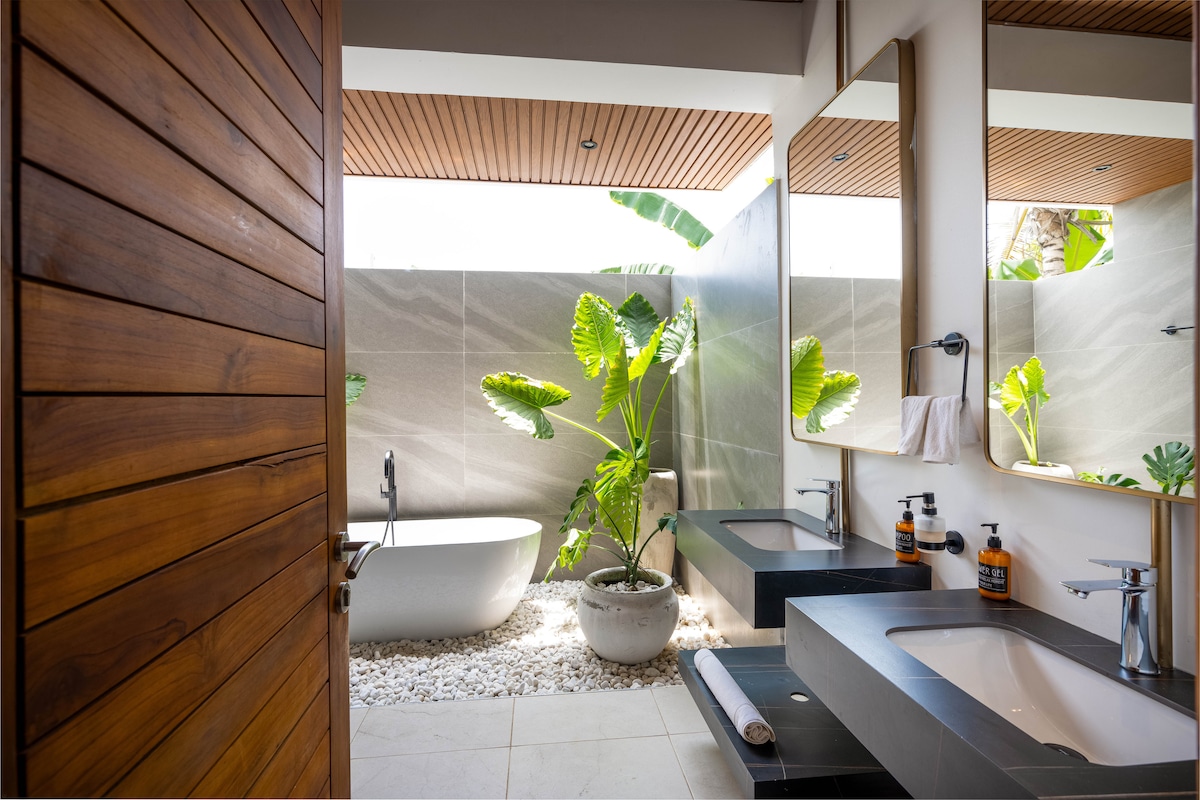 Новая полностью меблированная вилла с 2 спальнями с полной охраной, бассейном и потрясающим садом, идеально подходящая для молодоженов, семьи или друзей. Жилье расположено в Джамбиани менее чем в минуте ходьбы от главной дороги, в 3 минутах ходьбы от пляжа. 5 минут езды до Пахе. Напротив кафе Shanti Cafe, где можно получить такие услуги, как йога, завтрак, обед и ужин. Полное уединение, включая бассейн. Отдохните всей семьей в этом тихом месте.