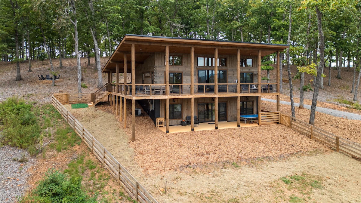 Relax in style at this modern cabin nestled between Helen and Dahlonega. Close to wineries, hiking, fishing, and shopping. Enjoy over an acre of privacy, a spacious deck, and upscale furnishings. Perfect for two couples or a family, with two king bedrooms featuring en suite baths, TVs, and large windows. Extra-long bunk beds comfortably sleep adults or teens. Paved road and driveway make for easy access. The perfect North Georgia getaway! STR-23-0073 Business lic 4767