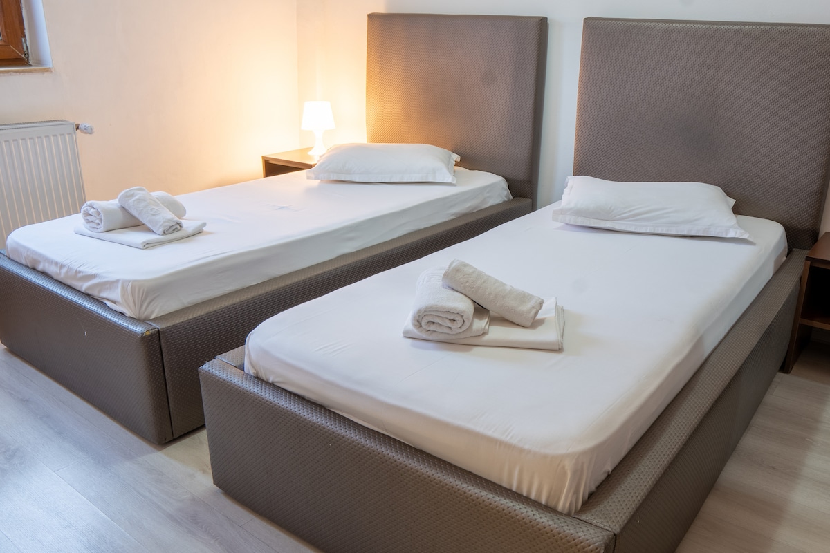 Camera privata de hotel tip garsoniera, compusa din dormitor cu chicineta tip open-space, baie privata cu dus. Camera beneficiaza de tv cu cablu, internet wifi, apa calda, incalzire in calorifer, frigider, cuptor cu microunde, fierbator de apa si chiuveta de bucatarie. Masina de spalat este intr-o camera tehnica si este de uz comun cu alti oaspeti din cladire.
