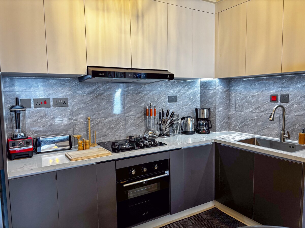★ Сверхбыстрый Wi-Fi 150 Мбит/с ★ 55-дюймовый телевизор в паре с премиальной звуковой панелью Sony. ★ Тихая комфортная зона — идеальное место для отдыха. ★ Роскошная кровать размера King size и комфорт премиум-класса. ★ Максимальная продуктивность: стол и стул без отвлекающих факторов ★ Полностью оборудованная кухня ★ Ежедневная уборка по запросу (свежие полотенца, стирка, безупречная чистота). ★ Индивидуальные советы по деловым мероприятиям, лучшим ресторанам и ночной жизни Найроби. ★ БЕСПЛАТНЫЙ трансфер из аэропорта JKIA при бронировании от 3 ночей. ★ БЕСПЛАТНАЯ приветственная корзина с завтраком по прибытии.