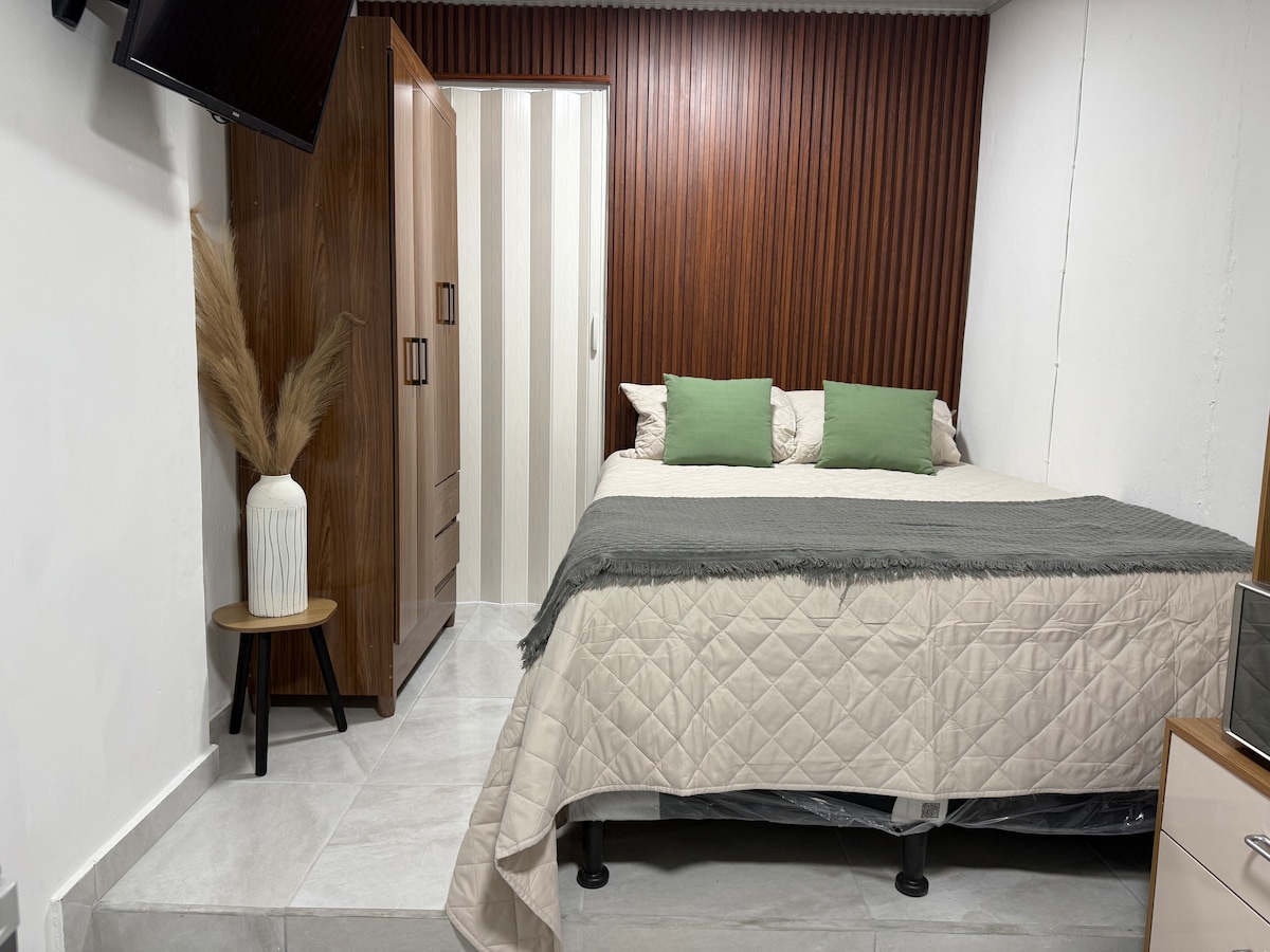 Disfruta de un espacio pequeño pero perfectamente diseñado para tu comodidad. El espacio ofrece todo lo necesario para una estancia práctica y confortable, ideal para viajeros solos o parejas. Cama tamaño full (1.35 x 1.90 m), smart TV, refrigeradora, microondas, licuadora, horno tostador, filtro de agua, cocina completamente equipada, escritorio, wifi y closet. El baño incluye ducha, agua caliente, secadora de cabello, shampoo, acondicionador, jabón, toallas y papel higiénico.