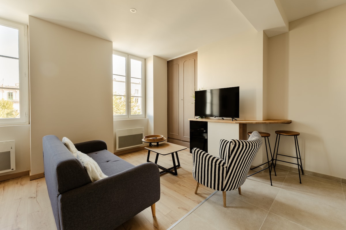 Joli studio de 23m2 entièrement refait à neuf en plein centre ville de Valence. Ambiance moderne et lumineuse. Studio climatisé, Wifi fibre, cuisine toute équipée (plaque, Four Micro-ondes, Frigo, cafetière expresso senseo ) lave linge, wc suspendu, sèche cheveux, linge de maison fourni. Vous pourrez utiliser le dressing aménagé. Le studio est entièrement sécurisé au 3ème étage sans ascenseur, d'une copropriété. Nous avons hâte de vous accueillir dans ce studio dédié à la location.