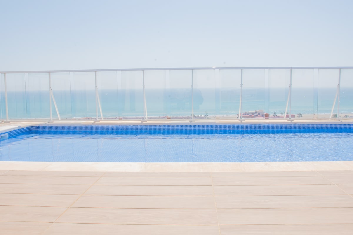 Квартира имеет свою индивидуальность. Он спроектирован декоратором и имеет все удобства, чтобы сделать ваше пребывание потрясающим. Панорамный бассейн на крыше, бассейн и терраса. Парковка Полноценная кухня. Обеденная зона, гостиная с большим телевизором с каналами, платформами и диваном-кроватью. Спальня с высококачественным матрасом, с хлопчатобумажными простынями. Ванная комната с феном, выпрямителем для волос и хлопчатобумажными полотенцами.