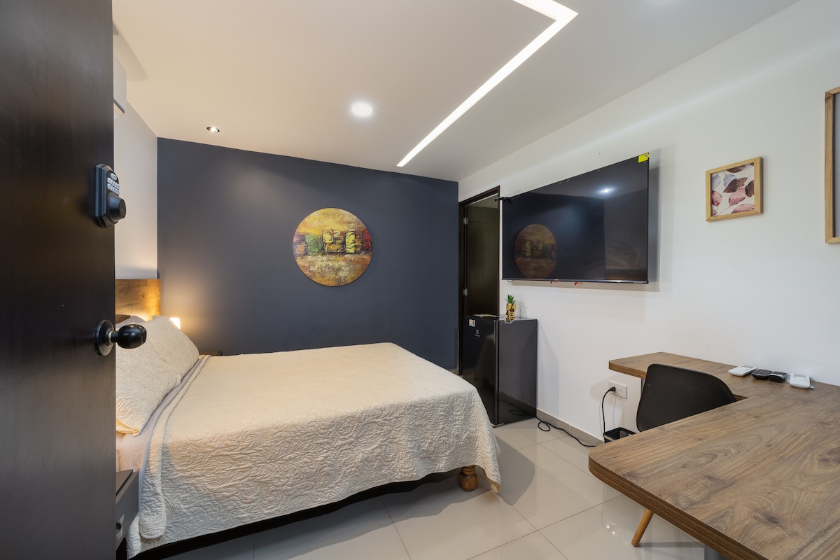 2-уровневая отдельная квартира/студия с крытой парковкой, кухней с посудой, холодильником, телевизором, вентилятором, шкафом, обеденным столом. Всего в 3 кварталах от торгового центра Unicentro и всего в 10 минутах езды от аэропорта (возможность прибытия на автобусе до остановки перед квартирой/студией) на 42-й улице (Recta Cali-Palmira). В жилом районе (Кана-Реаль) с продуктовым магазином в 1 квартале, постоянное наблюдение.