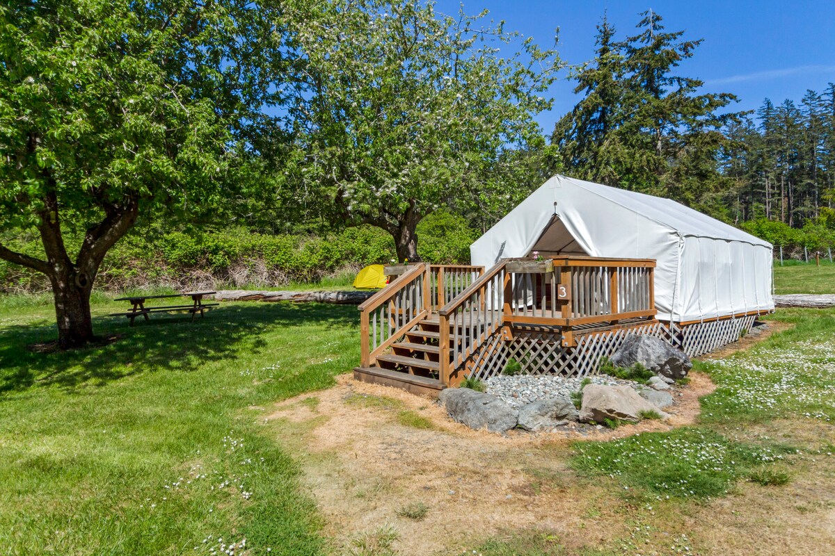 Красивая, просторная палатка Bell Tent расположена рядом с большим прудом в уединенном, безмятежном лесу на острове Солт-Спринг. Четыре спальных места с удобной кроватью размера Queen size, кушеткой и матрасом на полу. Удобства включают открытую кухню, кедровую террасу у пруда для обеда и отдыха, дополнительные зоны отдыха, душ с горячей водой на открытом воздухе и компостный туалет. Каяки, бочче, бадминтон, прямая линия. Идеальное место для романтического отдыха или отличного семейного отдыха.