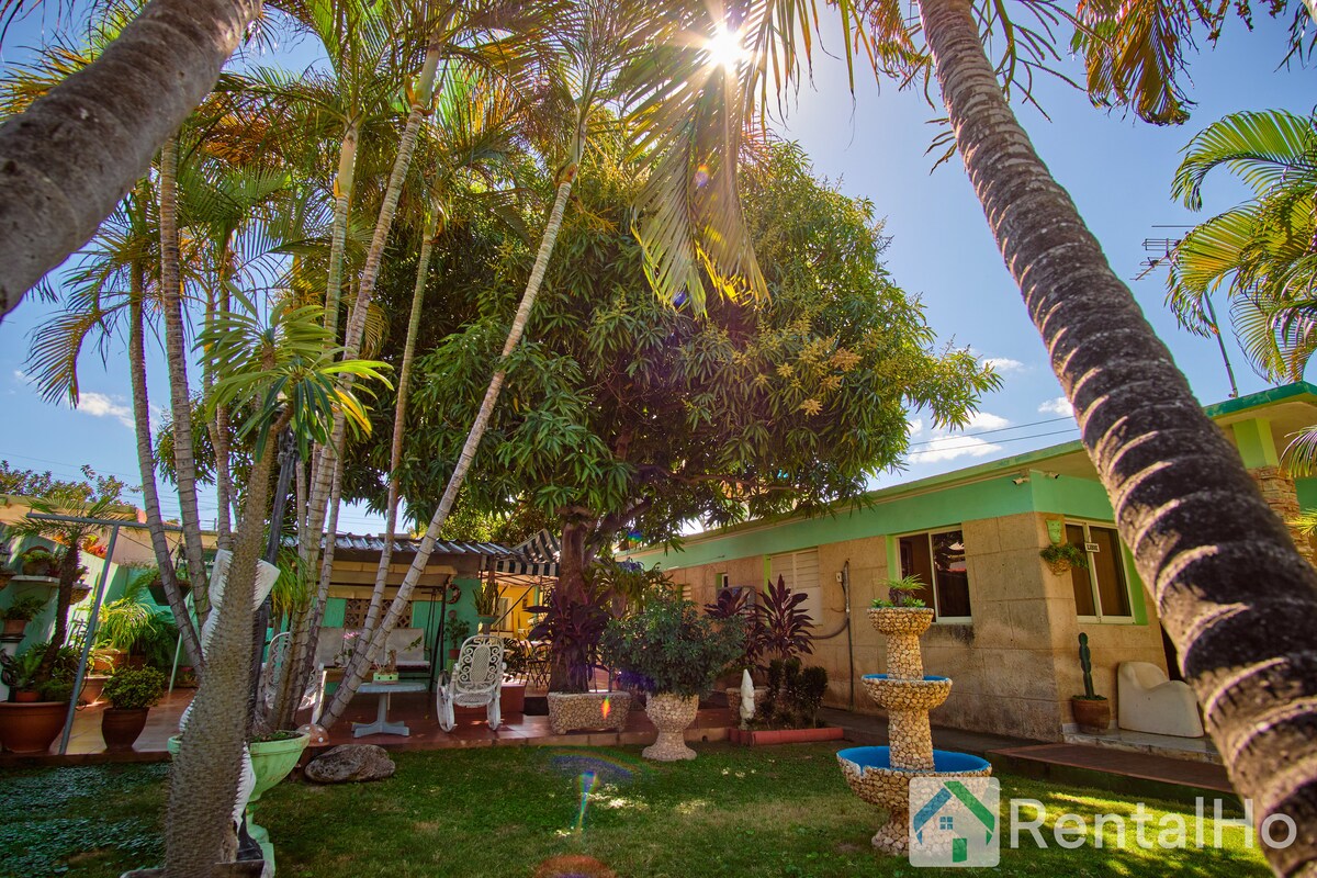 Это большая отдельная квартира. Со спальней с двумя кроватями (одна большая и одна поменьше), кондиционер, сейф, перхи для одежды. Ванная комната с горячей и холодной водой; кухня оборудована всем необходимым для приготовления пищи (микроволновая печь, кофеварка, тостер, кастрюли, газовая плита, холодильник), бар и три табурета для еды, комната с телевизором и общая терраса, окруженная растениями с креслами, столом и стульями и красивый сад. Можете пользоваться стиральной машиной.