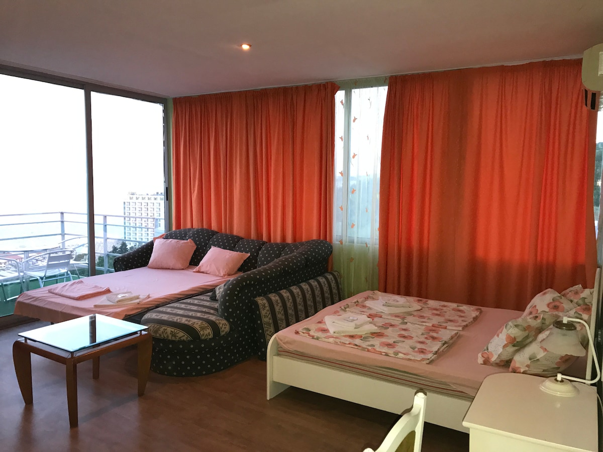 Квартира расположена на 3 этаже частного дома, отдельный вход. Солнечная терраса, с прекрасным видом на море. Дом расположен в природном заповеднике Золотые пески. В пешей доступности находится Монастырь Аладжа. До ближайшего пляжа Кабакум 2 км. В 200 метрах находится автобусная остановка, от аэропорта до дома 30 минут на прямом автобусе 409. Квартира современная, светлая и уютная. В доме есть еще одна квартира на 4-х человек, если вы путешествуете компанией, можете уточнить свободна ли она.
