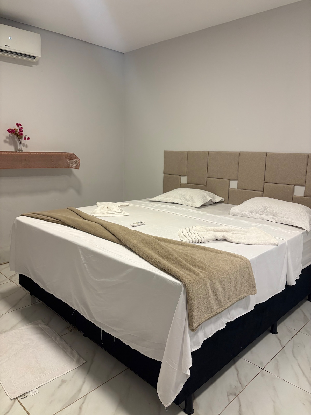 Очень чистые, уютные апартаменты с кроватью размера «queen-size» и раздельным кондиционером, комнатой со смарт-телевизором, NetFlix и лежащим диваном, WI-FI, полноценной кухней с дуплексным холодильником, плитой, кофеваркой, кастрюлями, столовыми приборами, балконом со стиральной машиной и скрученной одеждой, очень безопасно, с крытым гаражом, тихо и в нескольких метрах от пекарни, рынка, мясной лавки, очень хорошо расположен, с бассейном и электронным консьержем 24 часа.