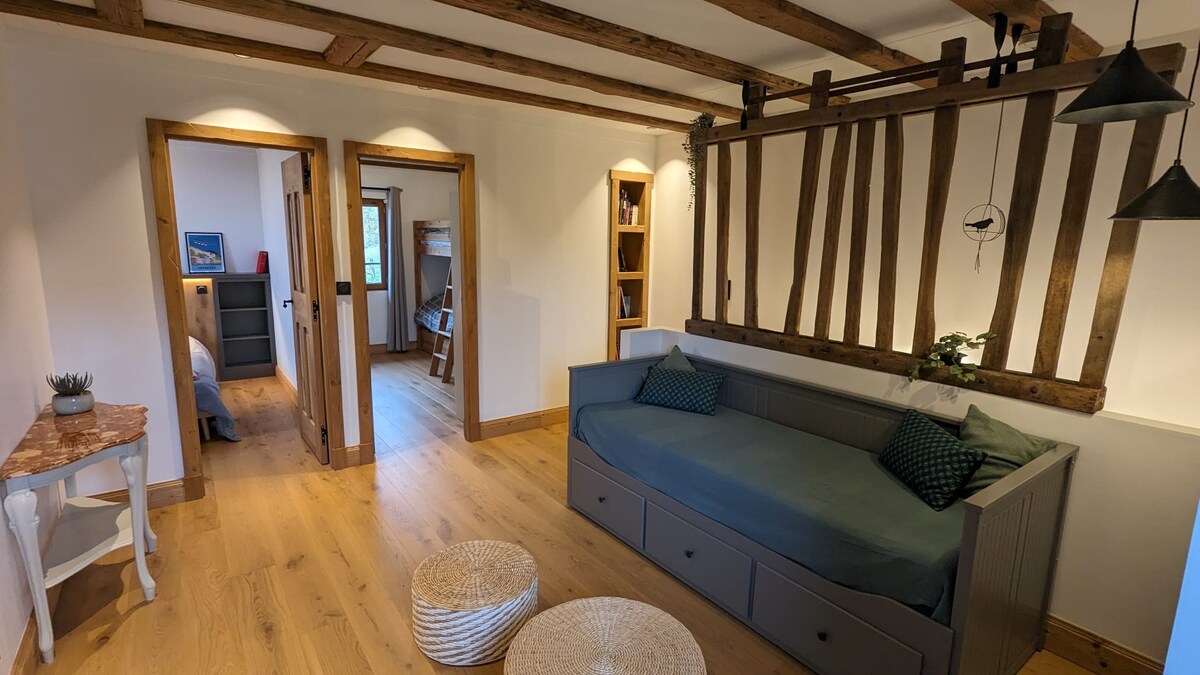 Мы с удовольствием рады приветствовать вас в нашем полностью независимом Le Clos d 'Olon gite в сельской местности с бассейном в 5 минутах от Rives и Moirans, в 10 минутах от Voiron и в 25 минутах от Гренобля. Мы предлагаем Вам комфортабельную квартиру до 4 человек площадью 50 м2 с оборудованной кухней, ванной комнатой, спальней с кроватью в 140 и гостиной, оборудованной диваном-кабриолетом в 140. Отлично подходит для отдыха, поездок или тренировок. С нетерпением ждём вас!