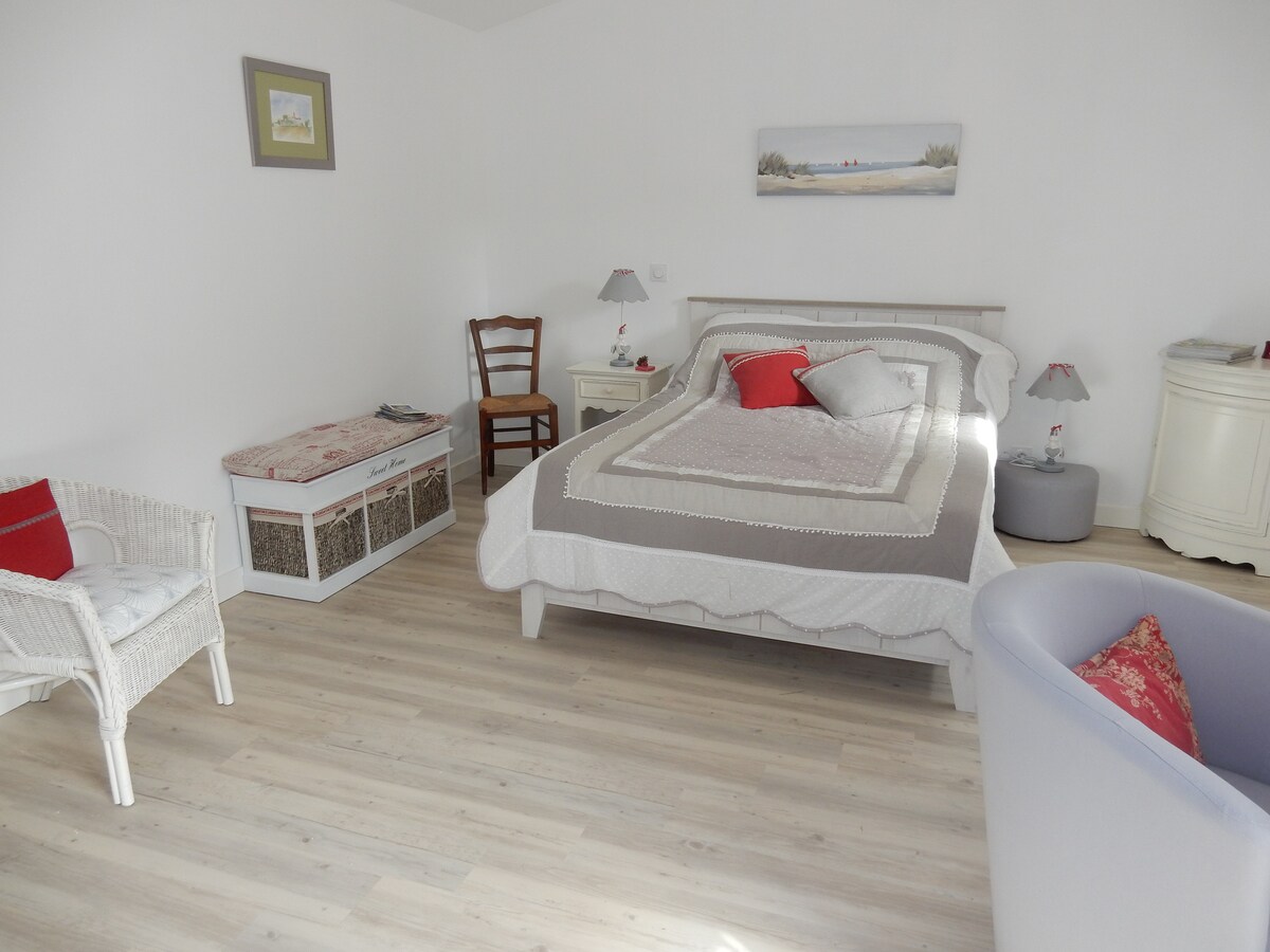 Главная спальня площадью 17 кв. м на первом этаже нового дома, в выделенном пространстве площадью 34 кв. м, почти в футах в воде! Пляж находится в 70 метрах🏖. В спальне итальянская гардеробная с душем +туалет и мини-кухня для приготовления только сэндвичей или салатов для пикника. Поблизости есть рестораны). Вы в 400 м от центра города и порта Пирс для островов . Château de l 'Auvergnac a 800 m , site of Pen Bron 6 km away