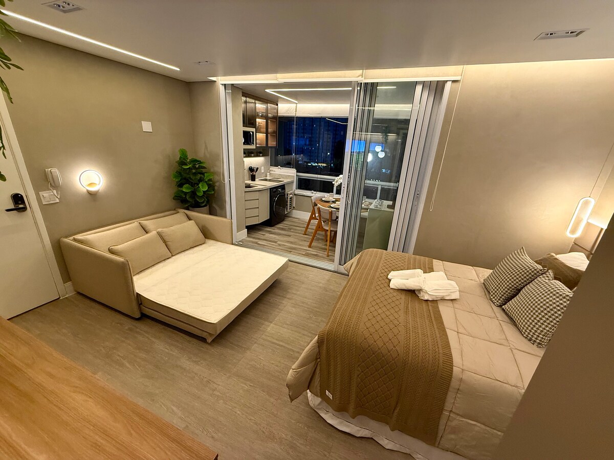 Estúdio espaçoso com muito design, arquitetura e a melhor vista de São Paulo. Loft completo! Com cama queen, closet, ar condicionado silencioso, cozinha completa, home office, WI-FI, TV 55” e uma belíssima banheira de imersão, de onde pode apreciar o seu drink preferido e curtir uma vista apaixonante. São Paulo toda estará há poucos minutos de você. Acesse o metrô andando apenas 200m. Reserve com tranquilidade! Proporcionaremos uma excelente hospedagem e uma ótima experiência!