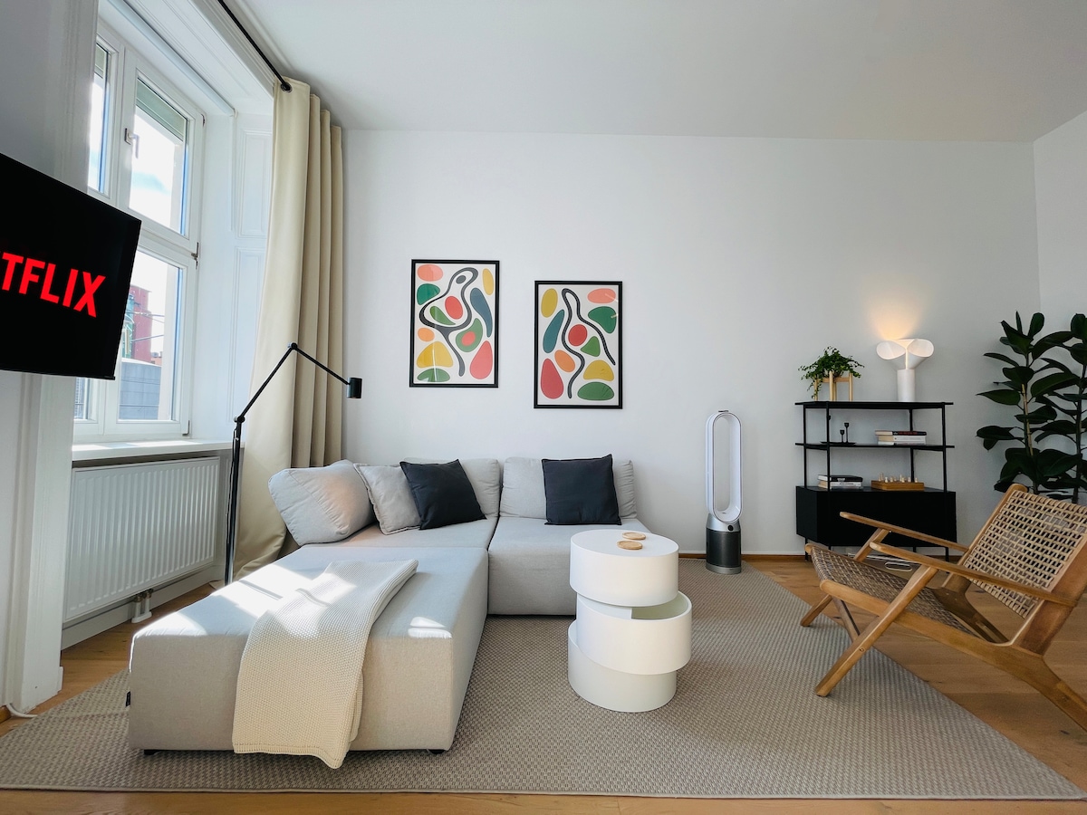 Discover city living at its finest in our newly renovated, highly central 40m² apartment. Nestled on the 2nd floor of a historic building, this exclusive space boasts a spacious living room, comfy bedroom, bathroom with toilet, and a well-equipped kitchen. Additional amenities include a sofa bed, TV, WLAN, washing machine, and a full kitchen setup. All your daily needs, shops, cafés and restaurants just around the corner. Immerse in art, culture, shopping and sights steps away.